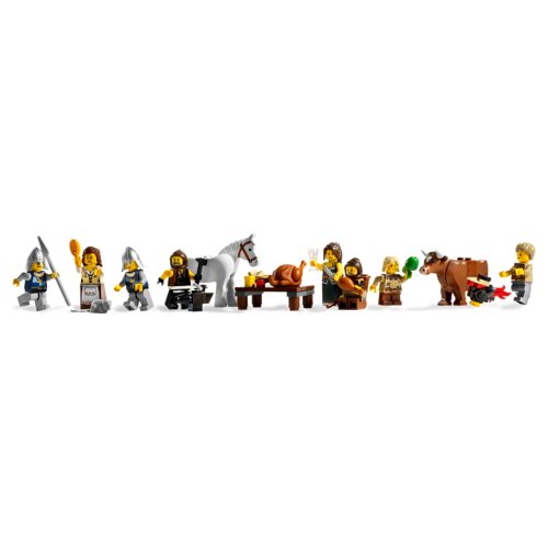 Cet ensemble médiéval contient deux batîments complets, un marché, et huit minifigurines ainsi que quelques animaux. De nombreux accessoires accompagnent le tout. Les deux maisons sont équipées d'intérieurs détaillés et peuvent s'ouvrir pour y accéder facilement. La première contient l'écurie et l'atelier du forgeron avec la roue à eau qui actionne le marteau alors que la seconde accueille l'auberge ainsi qu'une chambre à l'étage. Le marché lui accueille un stand de nourriture (pommes, volaille, fleurs,...) et une charrette. Un arbre se dresse au milieu de la place du village et de les animaux circulent un peu partout (deux vaches, un cheval, une grenouille, un rat, une poule, un coq et un canard). Pour donner vie à ce village, huit minifigurines accompagne le set : deux soldats, deux paysans, deux paysannes, un jeune garçon et un forgeron).