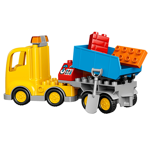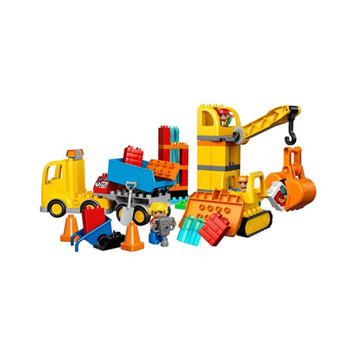 Le set 10813 - Le grand chantier est composé de trois engins : un camion benne, un bulldozer à chenilles et une grue avec une cabine rotative. Trois ouvriers de chantier avec leurs accessoires (marteau-piqueur, brouette et des cônes de circulation) sont inclus. De nombreuses briques viennent compléter le tout et permettent de construire un bâtiment.