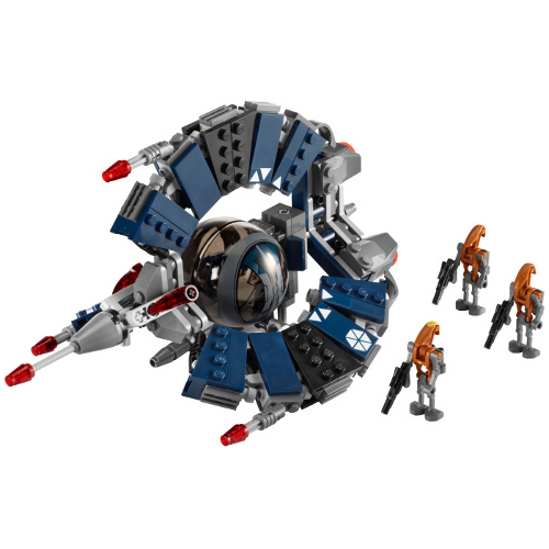 Que ce soit dans les films ou dans les séries animées je ne suis pas un grand fan des droïdes tant ils sont idiots et peu charismatiques (c'est des robots en même temps...) Les sets Lego ne font pas exception pour moi, la sauce ne prend pas....SAUF pour ce modèle.....Je dois avouer qu'il me plaît. Je ne sais pas si c'est sa forme, où les trois droïdes propres à ce set mais je le trouve particulièrement original et bien pensé. Je suis fan du globe central représentant l'unité intelligente entourée de trois "branches" portant les armes. Bref j'aime pas les droïdes mais ce modèle allez savoir pourquoi je l'aime bien. Point.