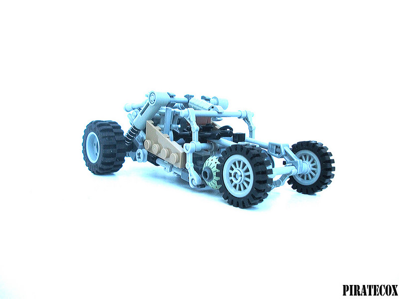 Celui-ci a été un petit délire créé en même pas une heure. But simple : un buggy entièrement tubulaire sans aucun tenons pour le chassis! La partie avant et centrale à été construite en quelques minutes seulement uniquement avec des barres 4L et des clips. Pour la suspension, j'ai eu l'idée d'y ajouter des amortisseurs technic,ce qui rend vraiment bien à mon goût! Le moteur à lui été inspiré par les moteurs des buggy VW,courroie en bas, filtres à air sur le dessus et double sortie d'échappement. Il ne me restait plus qu'à le rendre roulable, un siège, deux wedge plate 2x4 dark tan pour imiter l'effet desert et le tour est joué! Rien de bien méchant niveau armement ,ce véhicule étant fait pour aller dans le sable et non en première ligne dans les combats,deux mitraillettes embarquées et c'est tout!