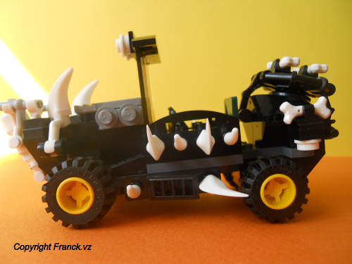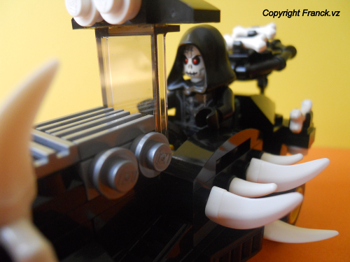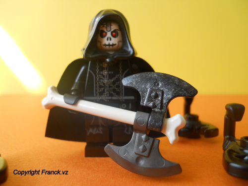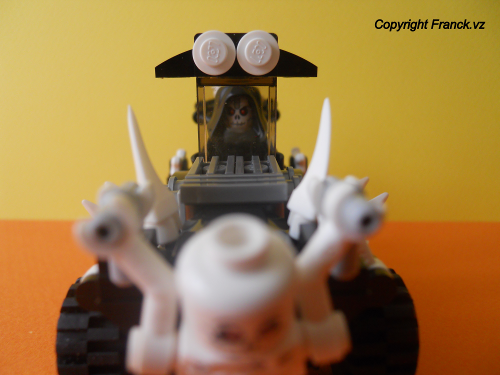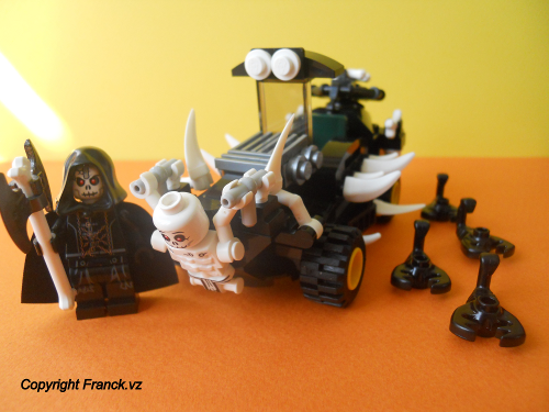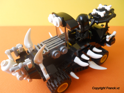 Je vous présente "the Black Skull" et sa terrible hache double tranchant : un perso sorti de mon imagination et de l'enfer. Pour l'accompagner j'ai créer un véhicule ressemblant aux caractères du personnage : "the Hell Skull Racer's". J'ai donc utilisé des pièces en majorité noires et blanches (sauf quelques exceptions, faute d'avoir les pièces adéquat). Je voulais également utiliser des pièces comme les dents (ou griffes) pour donner à ce bolide un aspect plus aggressif. Concernant le véhicule, le train arrière a été surélevé. J'ai également gardé l'avant, issu d'une précédente création ("Another Black Zero") a défaut d'avoir en pièce un bloc moteur. J'y est accroché une partie de squelette afin de donné à ce Racers un air plus terrifiant. A l'arrière se trouve un aileron dépliable à volonté... Les rivaux n'ont qu'à bien se tenir...